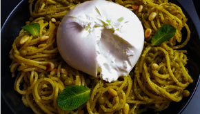 Pâtes au pesto de petits pois, menthe et burrata